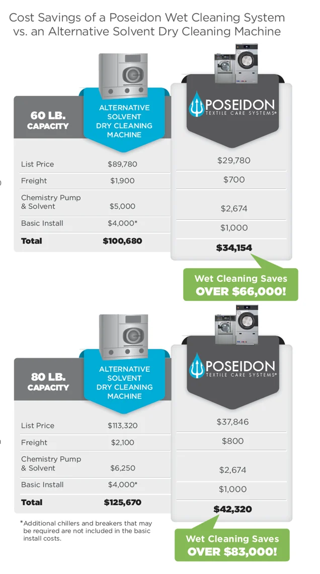 First, let’s evaluate the initial cost of each system. This is the amount required to purchase new alternative-solvent dry cleaning machines versus similarly sized Poseidon wet cleaning systems.