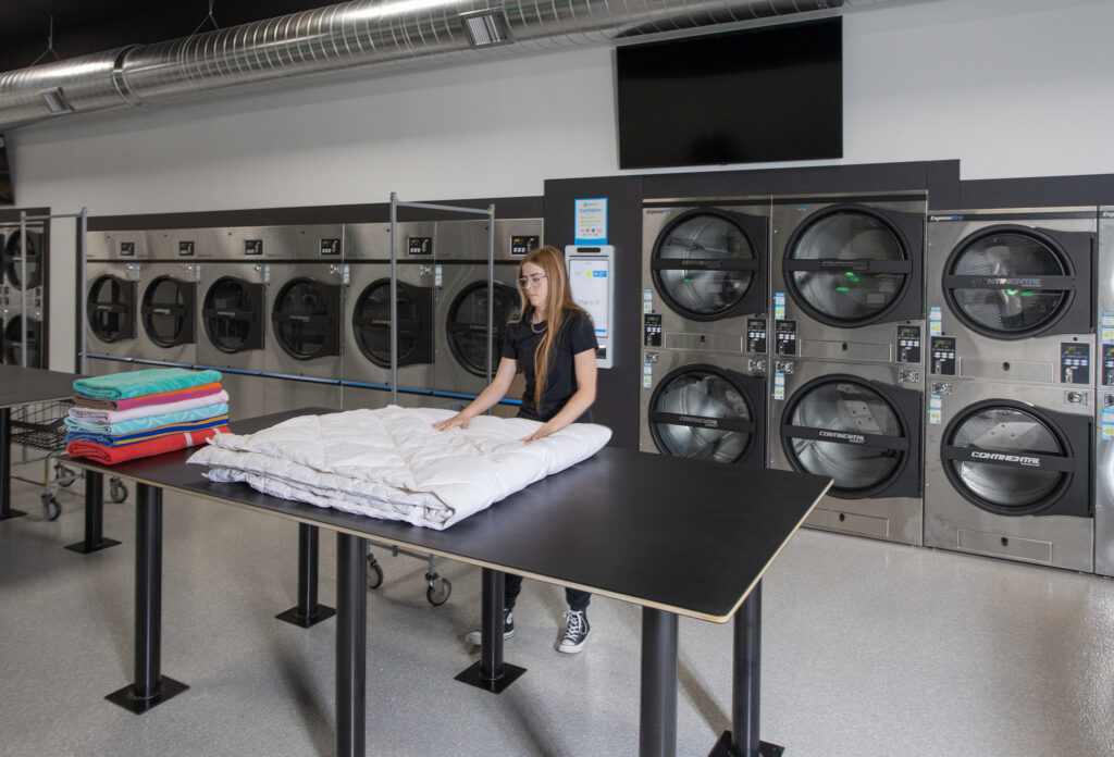 The adjoining 5,000-square-foot laundry consists of Genius Washers in 23, 45, and 80-pound capacities; ExpressDry+ 30- and 45-pound capacity stack dryers; and ExpressDry+ 75-pound capacity single-pocket dryers. The washers feature 360° Vision Corner Status Lights that illuminate in different colors as load status changes. This keeps customers apprised to their laundry’s status with a quick glance.