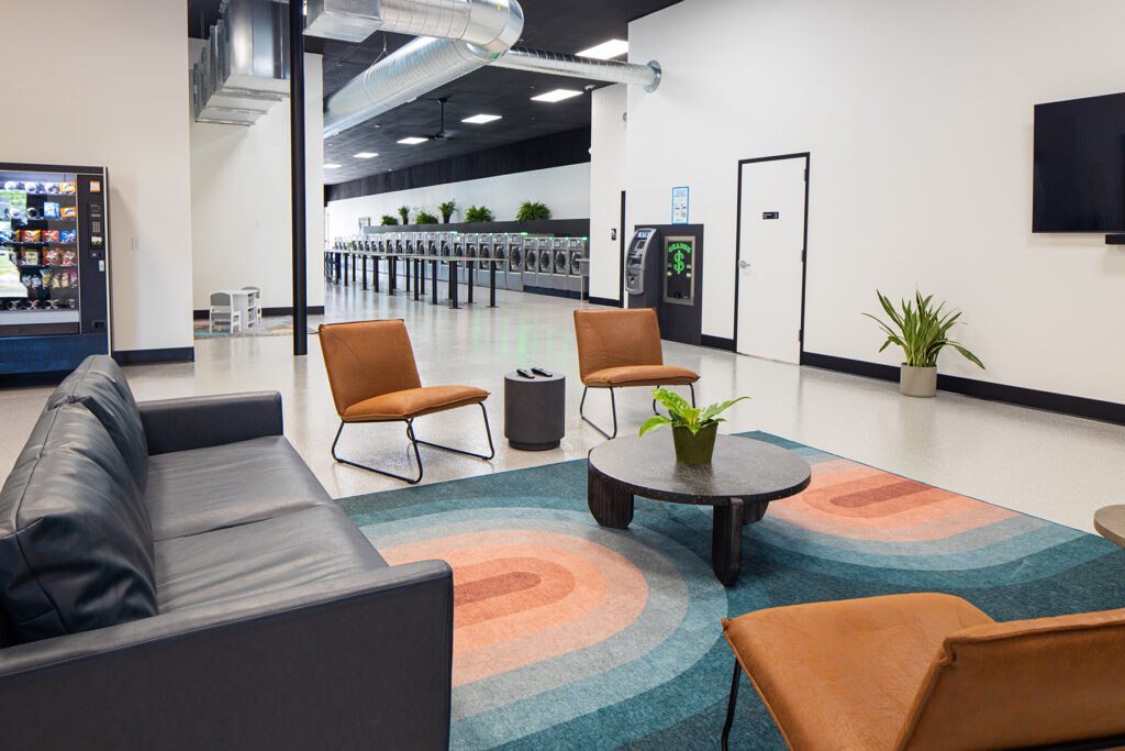 SmartWash amenities include free WIFI, 75-inch televisions, a kids’ play space, an ATM, vending machines, extra-wide aisles and a spacious lounge area.