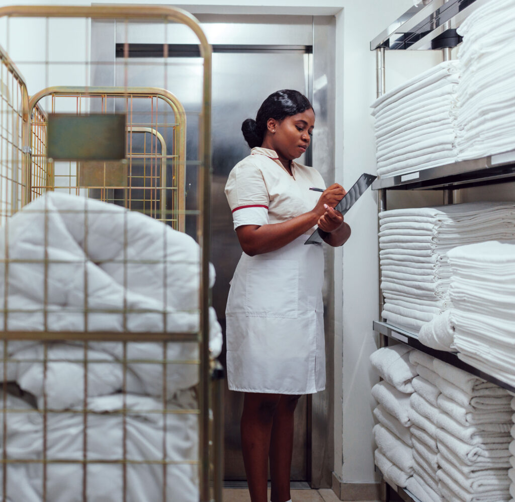 In preparing for peak season, be sure your linen and towel inventory (aka par level, Periodic Automatic Reestablishment) is deep enough to cover full occupancy over several weeks when considering your laundry’s daily production. Always, always invest in high-quality linens. You want your guests to relish your hotel bedding and plush robes, bath towels and pool towels. Plus, when it comes to laundry, high-quality textiles are easier to care for. Remember without enough pars, it will cost you excess labor for housekeepers to return to rooms they didn’t properly turn the first time and for laundry operators to wait on laundry to be completed.