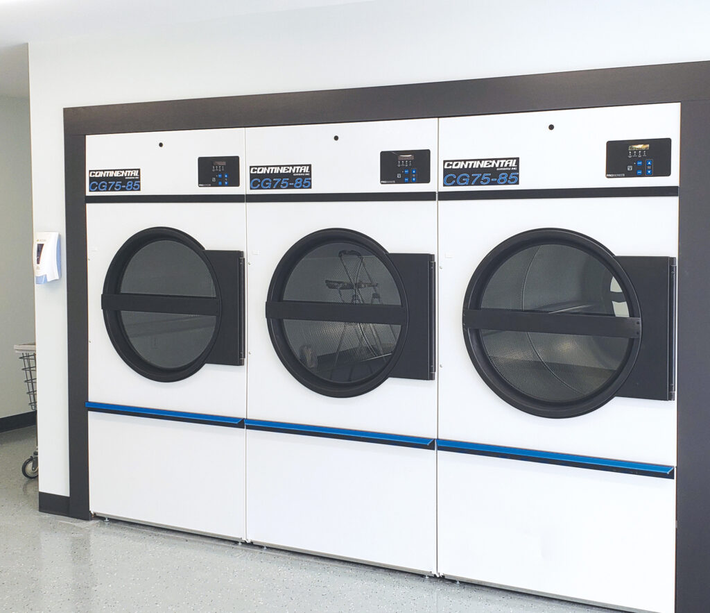 Ultimately, an old vended laundry in the community was reconfigured with a new hospital-grade layout and highly productive and programmable Continental Girbau E-Series Washers (a 30- and two 60-pound capacity models) and ProDry2+ Dryers (three 75-pound capacities), and an Articlean Ozone System. The laundry was designed to comply with Centers for Disease Control (CDC) guidelines, according to Samms and Carrington. “There’s a dirty side, where sorting and washing takes place, and a clean side for drying and folding,” said Samms.